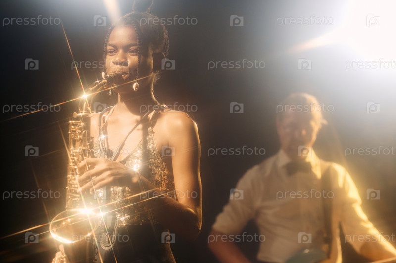 Черная женщина играет на саксофоне с группой на сцене в ночном клубе
