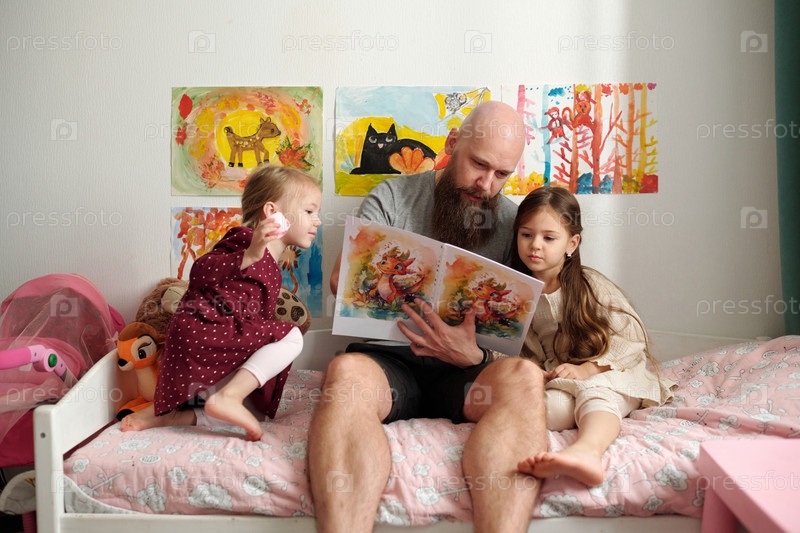 лысый мужчина показывает фотографии в книге