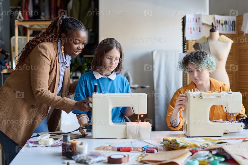 Черная женщина помогает девочкам-инвалидам в Ателье