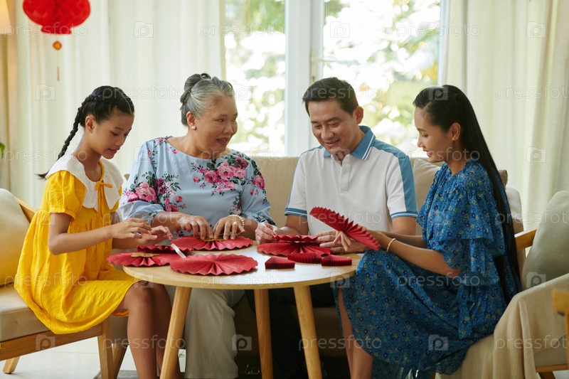 Семья, делающая бумажный вентилятор для Тет
