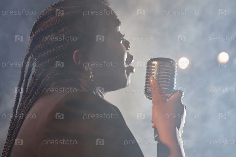Черная женщина поет в микрофон на сцене