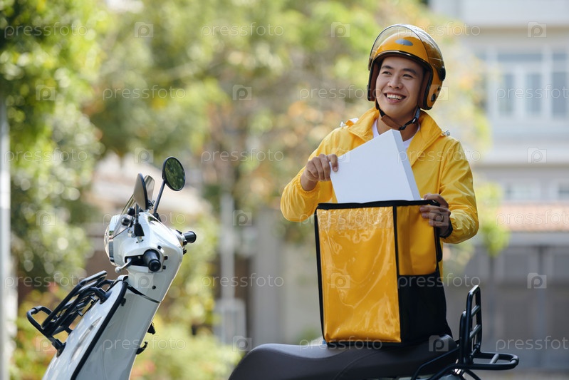 Курьер вынимает коробку из сумки
