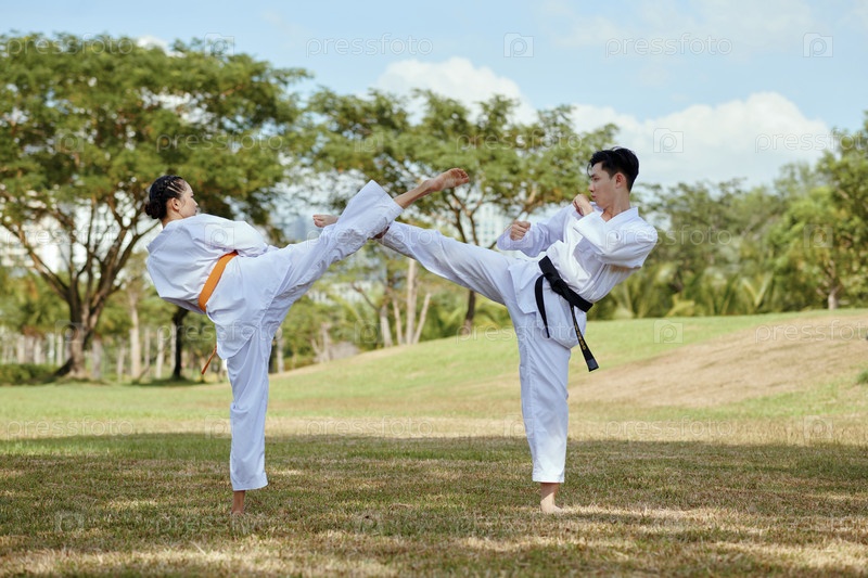 Спортсмены, делающие боковой высокий удар
