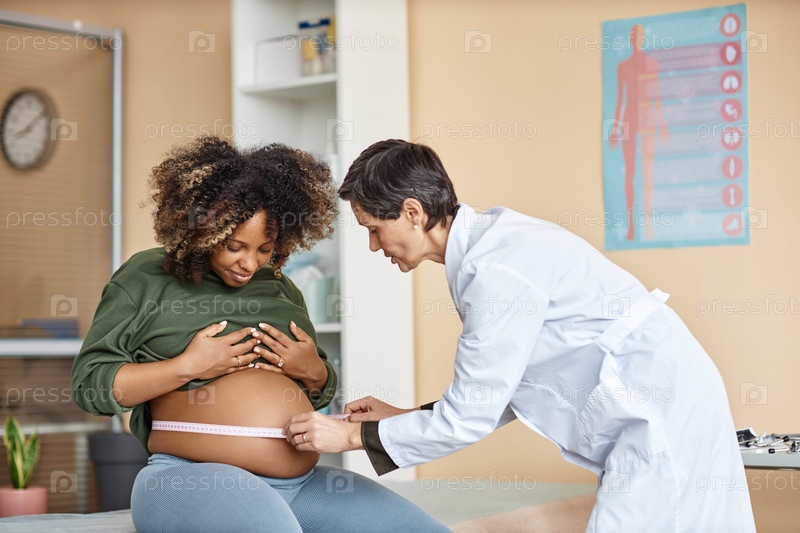 Женский гинеколог измеряет живот беременной женщины