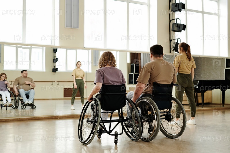 Люди, занимающиеся танцами на инвалидной коляске в классе в студии