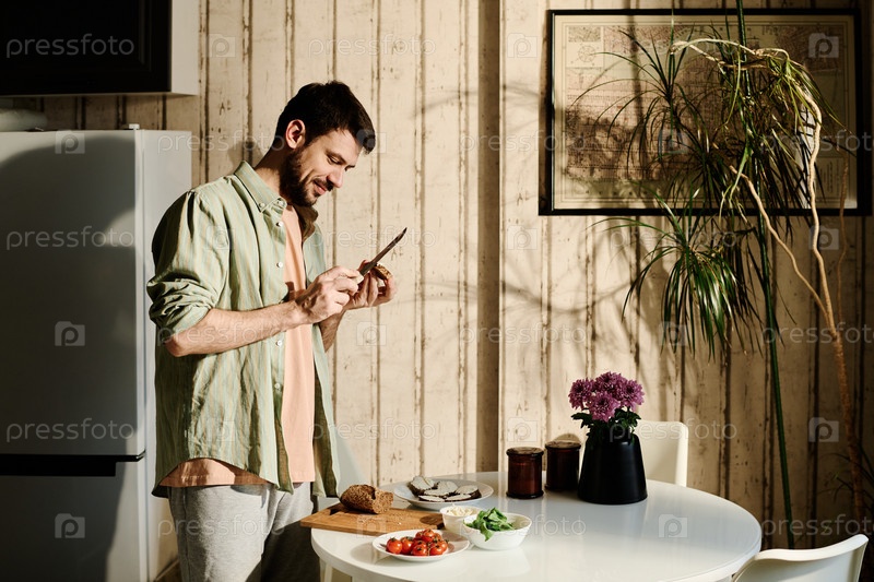 Молодой человек готовит бутерброды