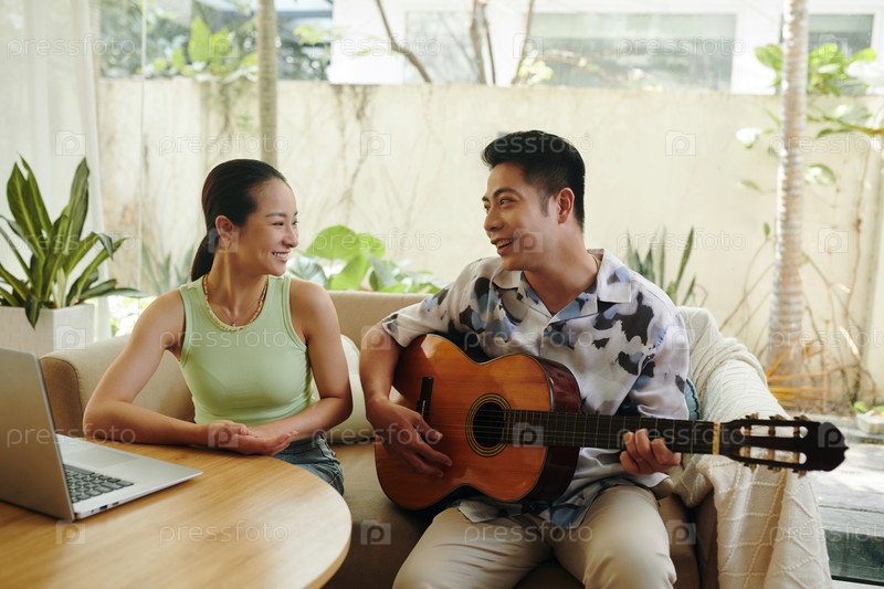 Мужчина играет на гитаре для подруги