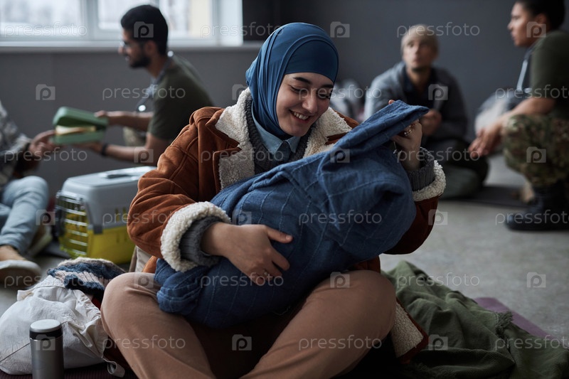 Ближневосточная женщина играет с ребенком в приюте для беженцев