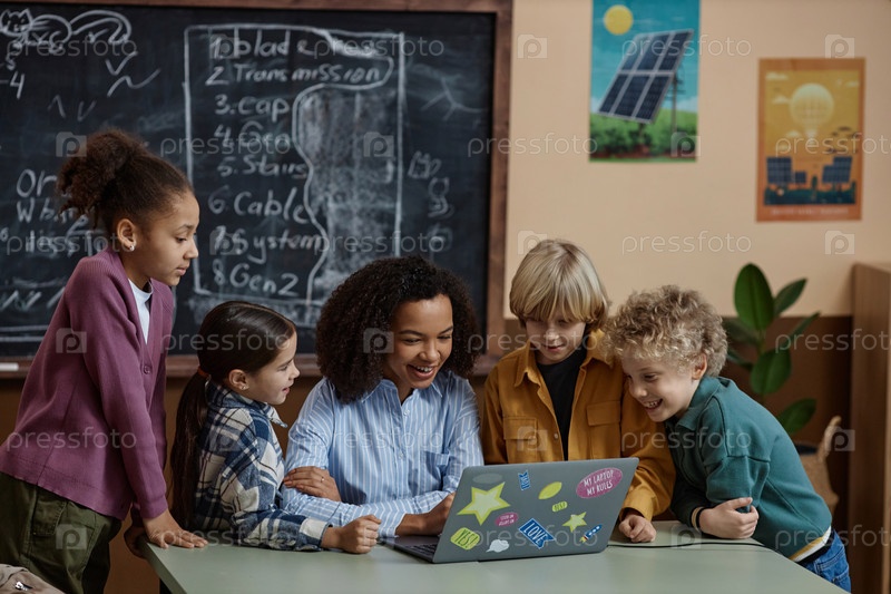 Учительница-чернокожая использует ноутбук с счастливыми школьниками, которые смотрят