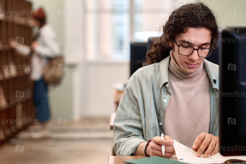 Молодой студент учится в библиотеке