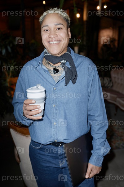 Черная женщина, одетая в джинсы улыбается на камеру с помощью флэша