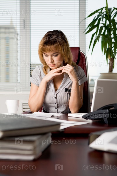 Фото привлекательной женщины, сидящей на рабочем месте в офисе и пьющей чай