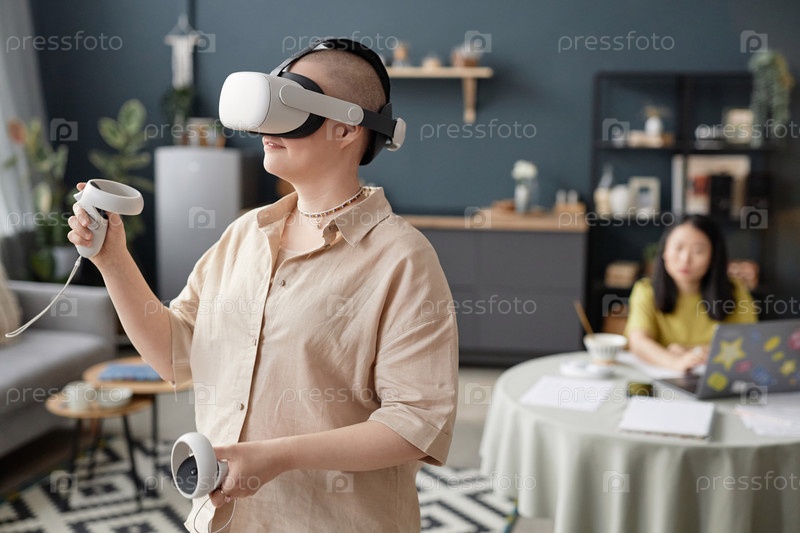 Молодая женщина играет в VR-игру дома