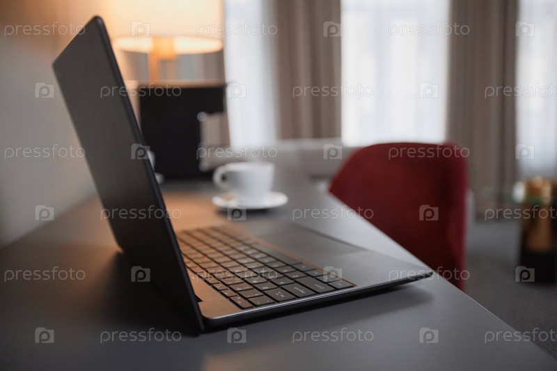Ноутбук на столе в гостиничном номере с открытой чашечкой кофе