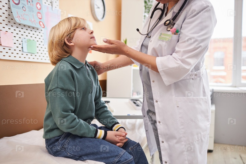 Мальчик сидит на кровати в клинике с педиатром, который проводит медицинское обследование