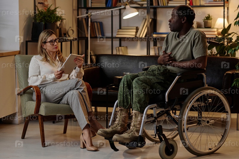 Ветеран войны с инвалидностью, имеющий сеанс с психологом мужчиной