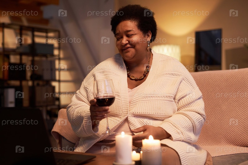 Чёрная старшая женщина с вином разговаривает по видеочату