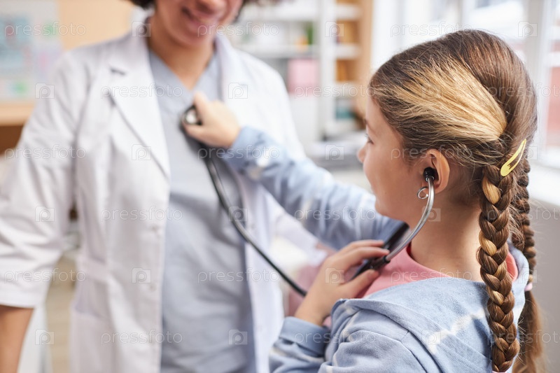 Девушка играет со стетоскопом в детской клинике