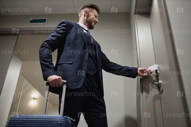 Улыбающийся бизнесмен открывает дверь гостиничного номера с ключевой картой