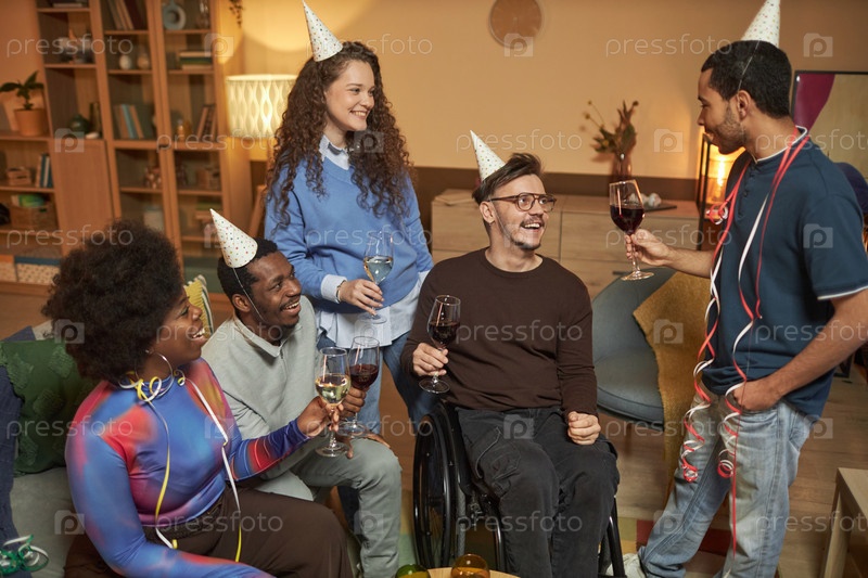 Мужчина с инвалидностью наслаждается вечеринкой с разнообразной группой друзей