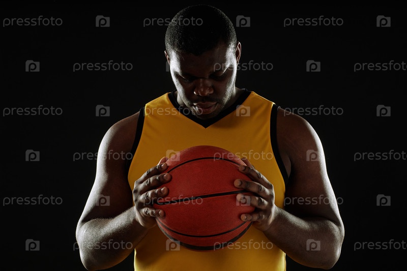 Мышечный баскетбольный игрок держит мяч на груди с подсветкой