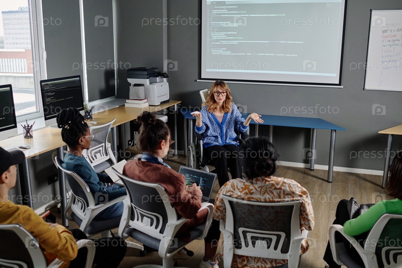 ИТ-специалист в инвалидном кресле выступает перед коллегами на деловой встрече