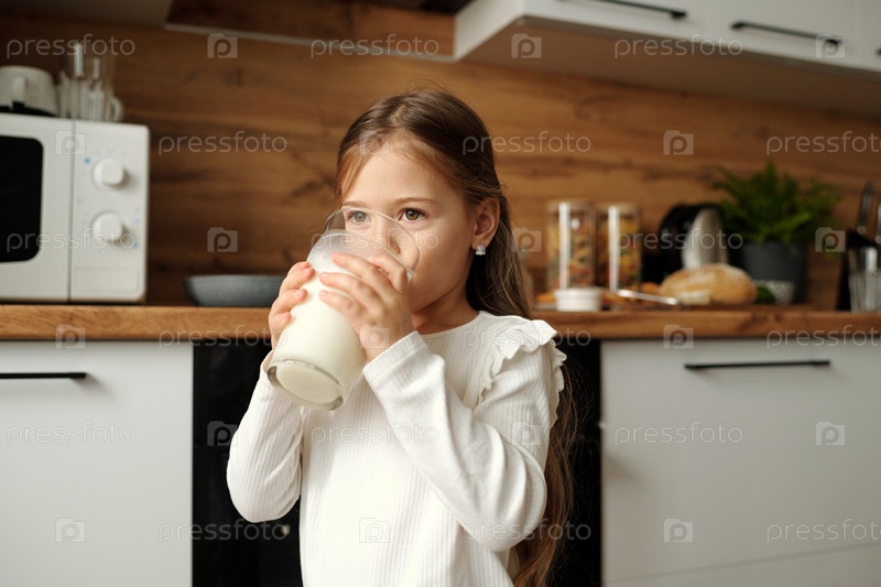 Маленькая девочка пьет стакан свежего молока