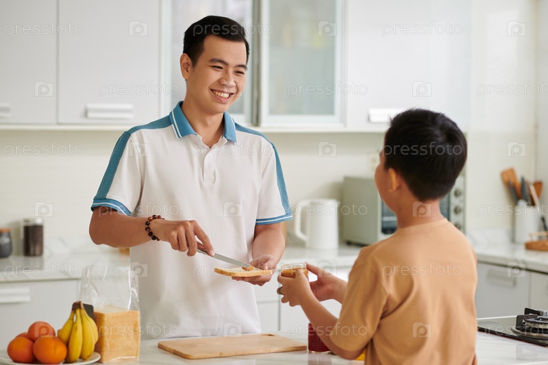 Сын помогает отцу готовить бутерброды