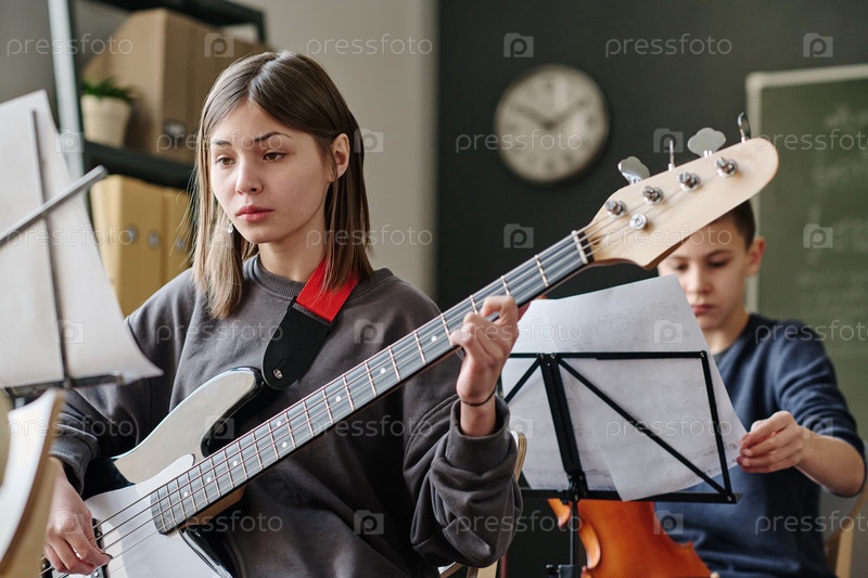 Подростковая девочка играет на бас-гитаре в школе