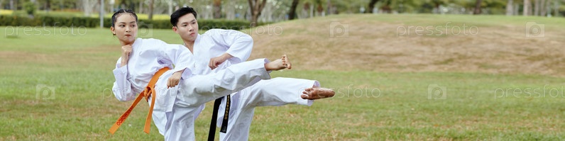 Спортсмены Тхэквондо делают боковой удар