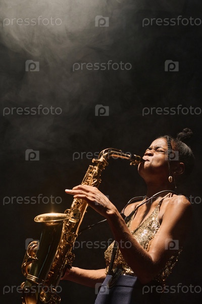 Черная женщина играет на саксофоне на сцене
