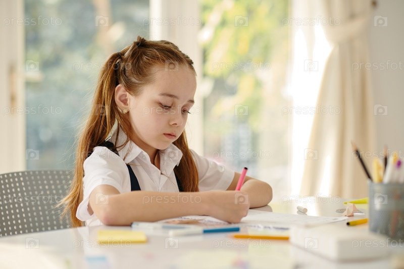 Школьница рисует в учебнике