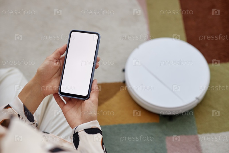 Женщина, держащая смартфон, работает с роботом-вакуумом