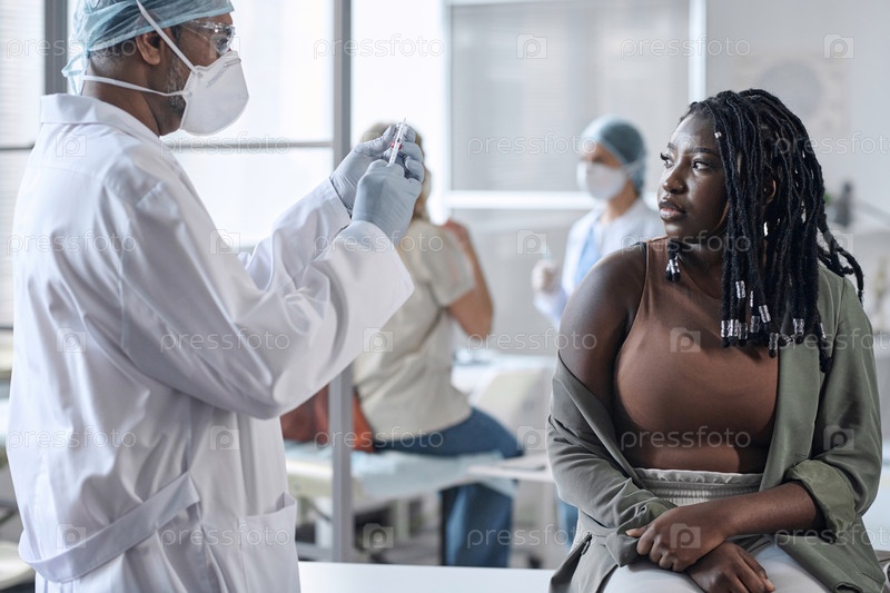 Черная женщина получает прививку в клинике