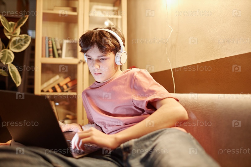 Мальчик-подросток использует ноутбук с наушниками, лежа на кровати