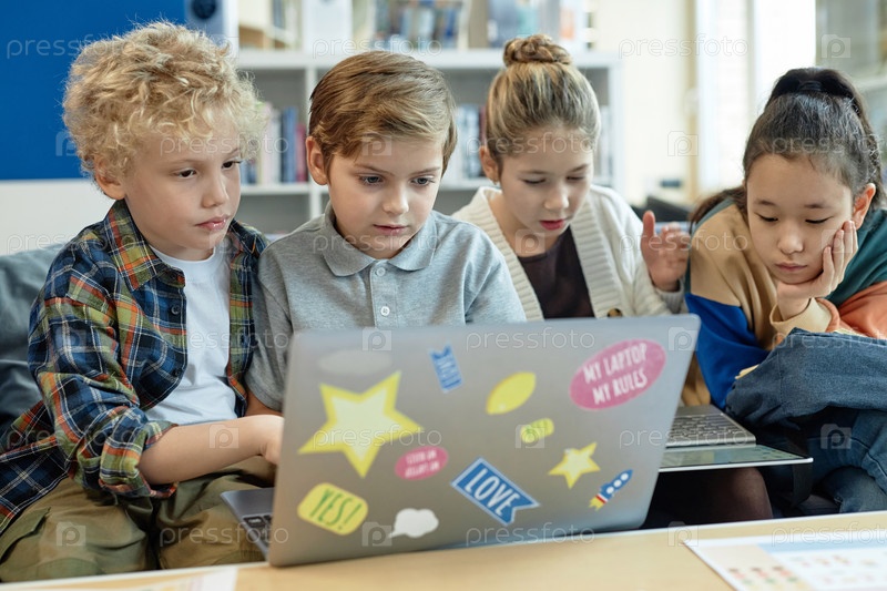 Дети, использующие компьютеры и делая домашнее задание в школьной библиотеке