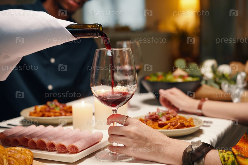 Мужчина наливает красное вино в бокал