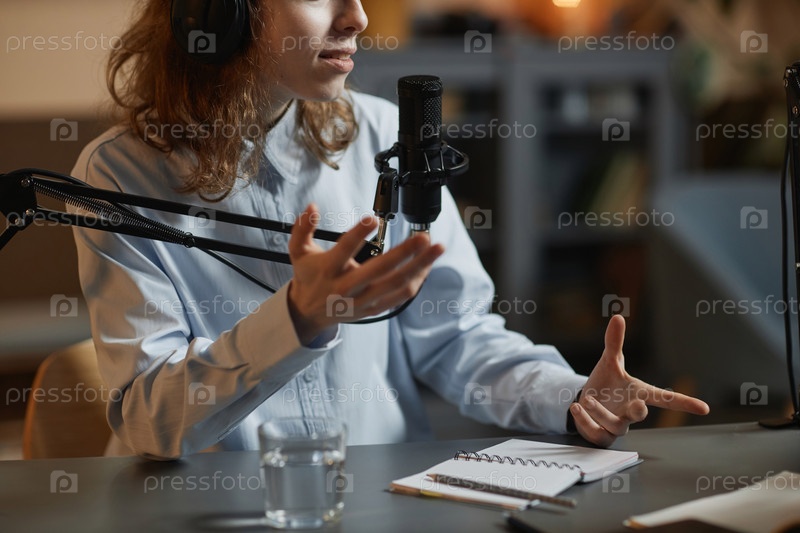 Женщина, говорящая в микрофон во время подкаста