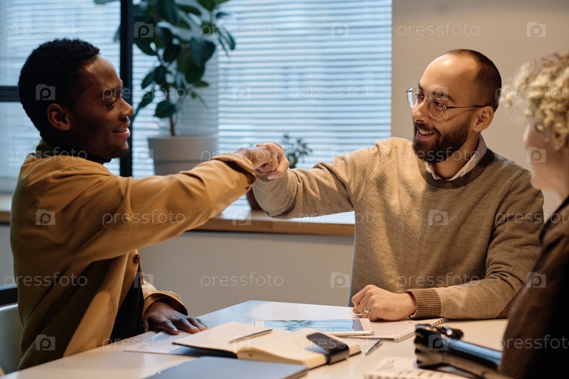 Позитивные офисные работники дают друг другу кулачный удар