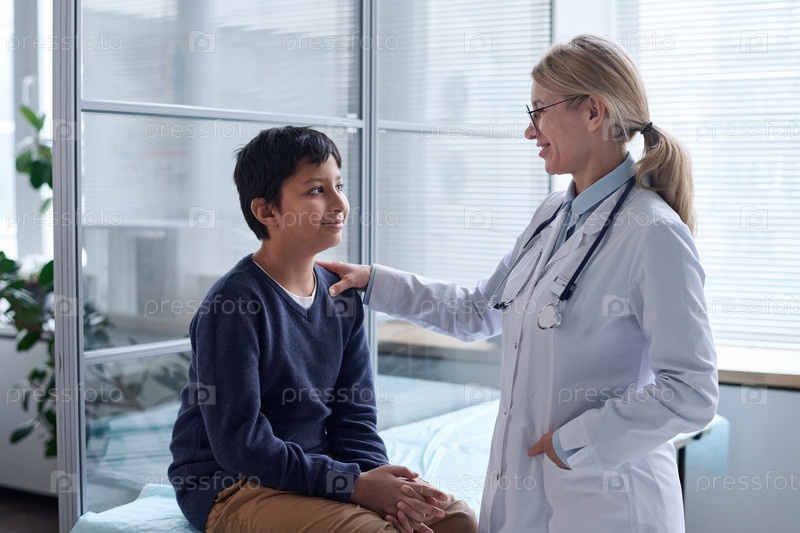 Женщина-врач, поддерживающая дружеского мальчика