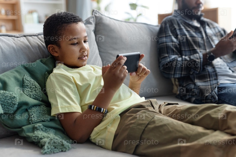 Чернокожий подросток использует смартфон на диване