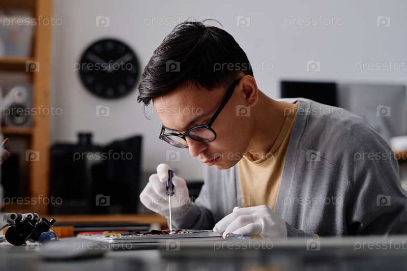 Молодой техник ремонтирует сломанное электронное устройство