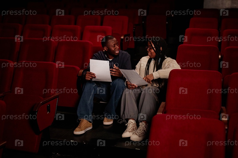 Два исполнителя сидят на полу в театре