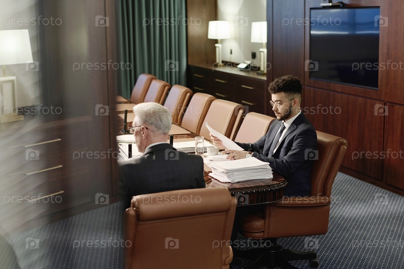 Профессиональные адвокаты работают с документами, сидя бок о бок за рабочим столом