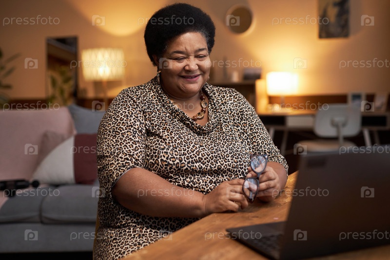 Старшая чернокожая женщина счастливо разговаривает через видеочат