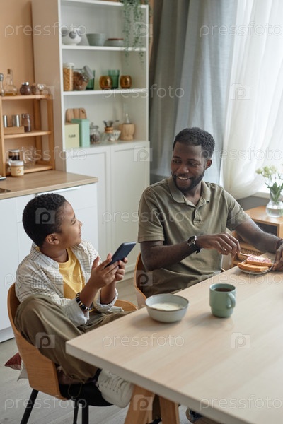 Улыбающийся чёрный отец и сын съедают завтрак вместе