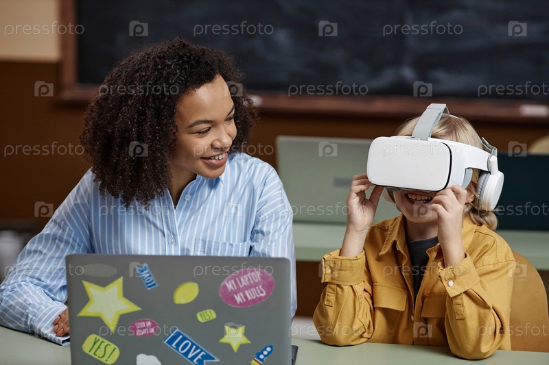Маленький мальчик, носящий VR-гарнитуру в классе