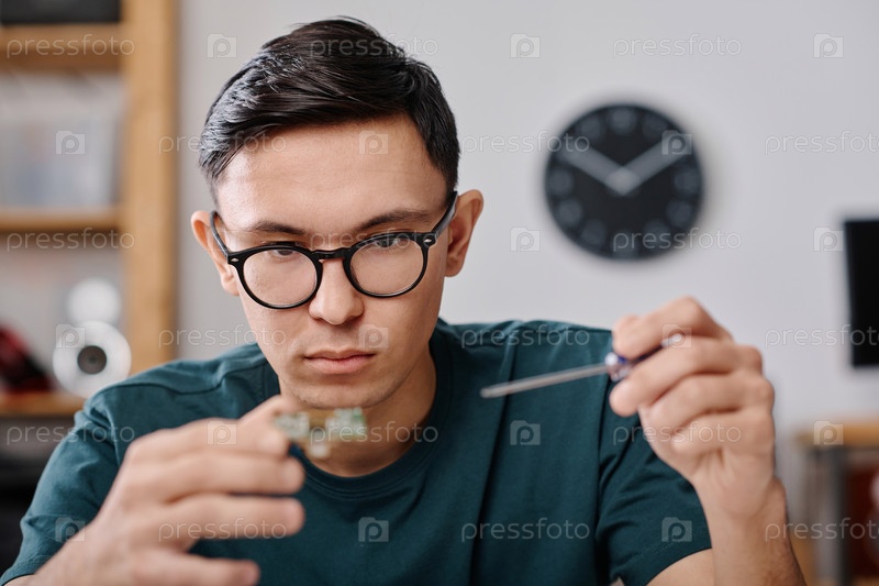 Портрет опытного техника, ремонтирующего материнскую плату в мастерской