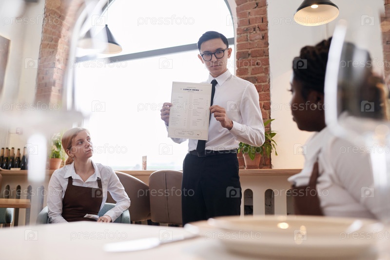 Владелец ресторана показывает новое меню ожидающему персоналу