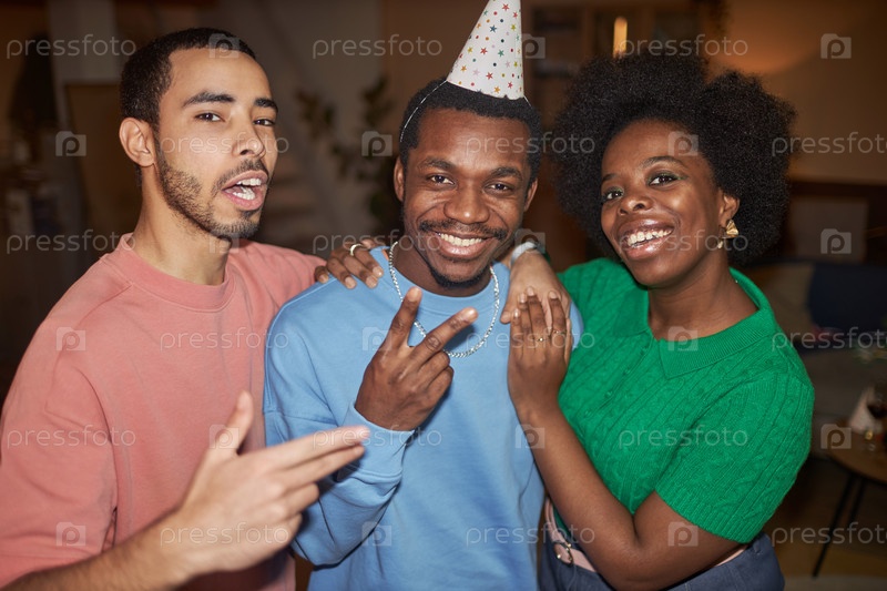 Друзья позируют вместе на вечеринке дома и улыбаются